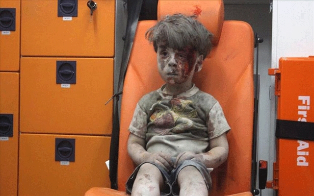 نشر ناشطون في المعارضة السورية لقطات مؤرقة يظهر فيها عمران بعد إنقاذه من تحت الأنقاض، حيث سويت البناية التي كان يسكنها مع أهله بالأرض نتيجة غارة مدمرة.