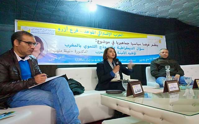 قالت نبيلة منيب، الأمينة العامة للاشتراكي الموحد، في عرض سياسي تحت عنوان "سؤال التنمية والديمقراطية"، نظمه فرع الاشتراكي الموحد، بأزرو، واحتضنته ثانوية أزرو، يوم الجمعة 25 ماي 2018، كثيرون من يتحدثون عن تقوية الديمقراطية وتقوية المسار الديمقراطي.. مشيرة إلى أن أولى الخطوات التي يفترض أن تقطعها أي دولة قبل الوصول الى الديمقراطية هي إنجاح الانفتاح الاقتصادي واحترام حقوق الإنسان. مضيفة أن بلادنا لم تنجح في تحقيق الانفتاح الاقتصادي، فهناك الريع وهدر الأموال العمومية التي ترتكز على الإفلات من العقاب وغزو من خلال اتفاقيات التبادل الحر التي لم يشرك فيها الشعب المغربي، بالإضافة إلى غياب أسس تؤسس لتنافسية حقيقية. وفيما يتعلق باحترام حقوق الإنسان أشارت منيب أن دستور 2011 وعلى غرار دستور 1996 و دستور 1992 نص على مجموعة من الحقوق والحريات، لكن يبقى السؤال المطروح فيما يتعلق بإحقاق هذه الحقوق.