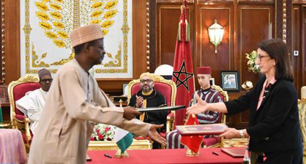 إثر ذلك، ترأس الملك محمد السادس ورئيس جمهورية نيجيريا الفدرالية، محمدو بوهاري مراسم التوقيع على ثلاث اتفاقيات للتعاون الثنائي. ويعد الاتفاق الأول تصريحا مشتركا بين المملكة المغربية وجمهورية نيجيريا الفدرالية، ويهم المشروع الاستراتيجي لإنجاز "أنبوب غاز" إقليمي يربط الموارد الغازية لنيجيريا بدول غرب إفريقيا والمغرب. ووقعه كل من أمينة بنخضرة وفاروق غاربا سعيد.