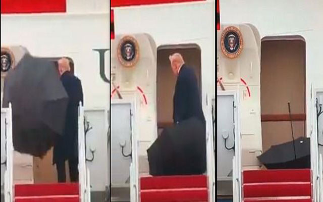 انتشرت موجة سخرية من الرئيس الأمريكي دونالد ترامب، على وسائل التواصل الإجتماعي بعد فشله في غلق مظلته مما اضطره لتركها على باب الطائرة الخاصة به. وتداول مستخدمي "تويتر" مقطع فيديو يوضح الموقف كاملا، حسبما أوردته صحيفة "دايلي ميل" البريطانية في تقرير لها بعنوان "ترامب يفشل في إغلاق مظلته ويتركها بلا مبالاة على باب الطائرة".