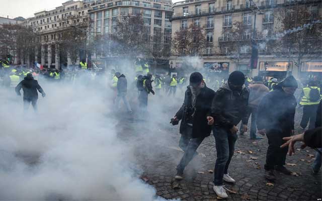 استخدمت قوات الأمن في باريس اليوم السبت 24 نونبر 2018 الغاز المسيل للدموع وخراطيم المياه لتفريق متظاهرين حاولوا اختراق طوق للشرطة في جادة شانزيليزيه.