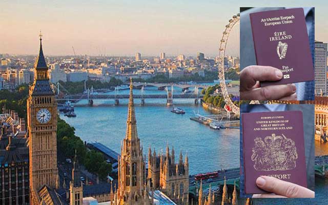 ويحق لأي شخص ولد في جمهورية إيرلندا أو في إيرلندا الشمالية أو ولد لأبوين أو جدين إيرلنديين الحصول على جواز سفر إيرلندي، أي أن ذلك من حق نحو ستة ملايين بريطاني إجمالا؛ وبمقدورهم حمل جنسيتين.