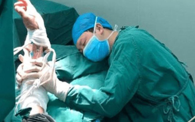 وذكرت صحيفة "ديلي ميل"، أن الجراح الصيني، لو شانبينغ، عمل لمدة 20 ساعة متتالية وأجرى 6 عمليات جراحية صعبة، بعدها غط في النوم بمكان العمل.