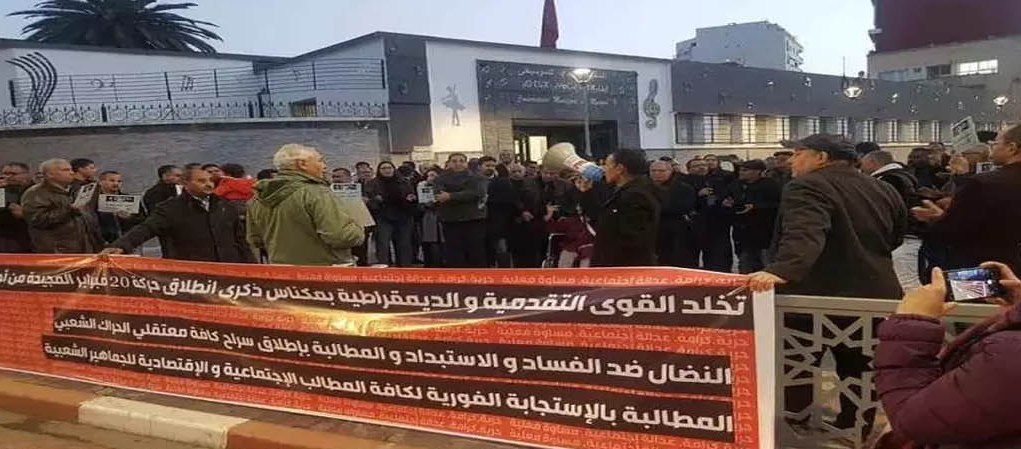 نظمت  القوى التقدمية والديمقراطية بمكناس مساء أمس  19 فبراير 2019 وقفة احتجاجية تخليدا لذكرى الثامنة لحركة 20 فبراير طالبت من خلالها باطلاق سراح جميع المعتقلين السياسيين، وقد رفعت خلال الوقفة شعارات تندد بتردي الأوضاع الإقتصادية والإجتماعية، كما تم التأكيد على ضرورة الاستجابة الفورية للمطالب الاجتماعية للنقابات وكافة التنسيقيات المطلبية وانخراطها اللامشروط في كافة أشكالها النضالية.
