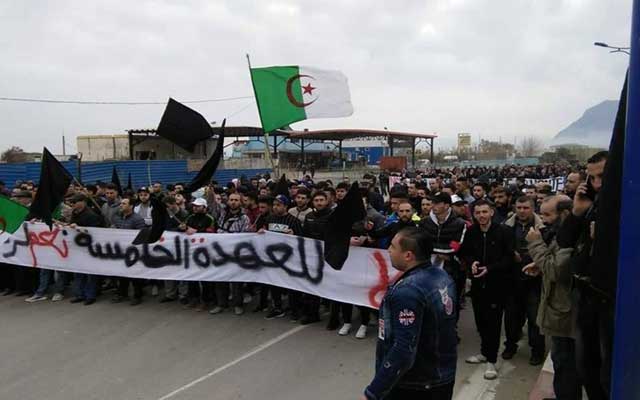 وحمل المتظاهرون لافتة كبيرة كتب عليها "لا للعهدة الخامسة نعم لرحيل النظام"، بحسب ما أظهرته الصور التي تداولتها مواقع التواصل الاجتماعي.