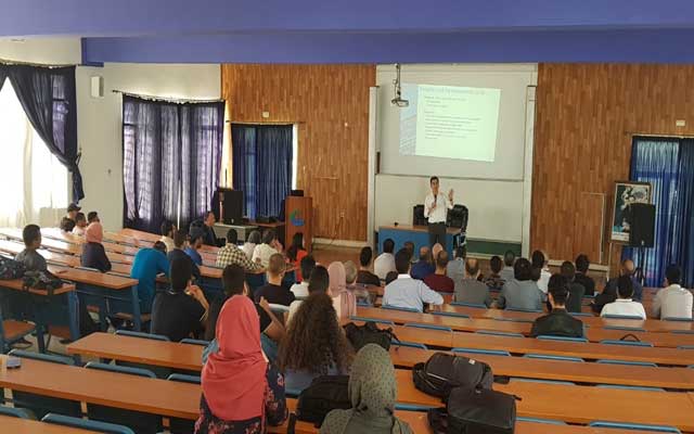 تمحورت محاضرته حول موضوع: «دور الجامعة من اجل تنمية مستدامة وكيفية جعل من جامعتك واحدة من أرقى الجامعات العالمية » حيث ركز الأستاذ المحاضر على الركائز الأساسية لإنجاح مشروع اية جامعة انطلاقا من تجربته بجامعة دلفت الهولندية و التي أسست سنة 1986 من القرن الماضي و التي أصبحت الآن تحتل المرتبة الأولى في هولندا و المرتبة 17 عالميا.
