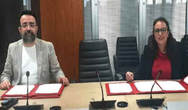 منى لبنيوري، المديرة العامة لبنك اليسر ، إلى جانب هشام السرغيني، المدير العام للصندوق المركزي للضمان، خلال توقيع الاتفاقية