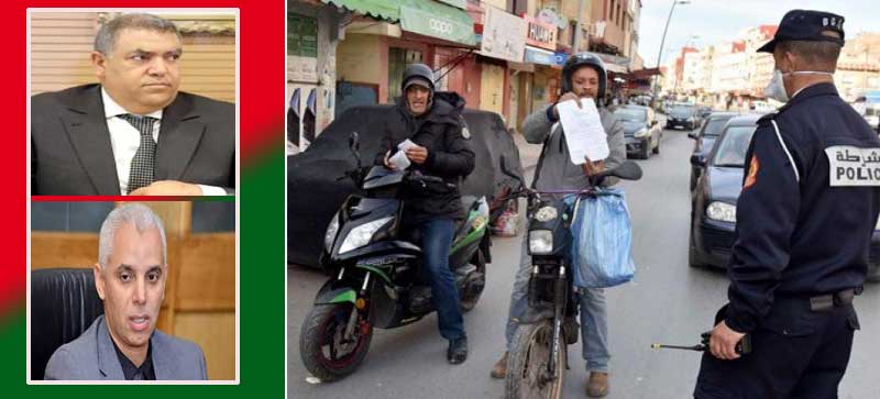 مشهد لحالة الطوارئ الصحية، وفي أعلى الصورة يسارا، عبد الوافي لفتيت، وزير الداخلية، ووزير الصحة خالد أيت طالب