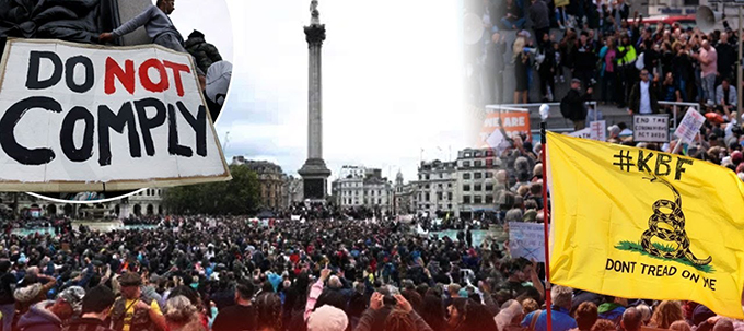 وشوهد ميدان ترافالغار ممتلئًا تقريبًا بالمحتجين دون كمامات ولا تباعد اجتماعي، حاملين لافتات تصف الوباء بأنه "خدعة".