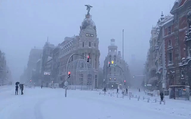 وغطت مدريد ومناطق في إسبانيا طبقة كثيفة من الثلوج يومي الجمعة والسبت ما أدى إلى توقف الحركة السير على الطرق الرئيسية والتي لا يزال بعضها مغلقا حتى صباح اليوم الأحد كما توقفت حركة سير القطارات من وإلى مدريد . وتتجه العاصفة الثلجية نحو المناطق الشمالية والشرقية خاصة باتجاه آراغون وكتالونيا التي شهدت في اليومين الماضيين تساقطات ثلجية أقل من المناطق الداخلية وسط البلاد.
