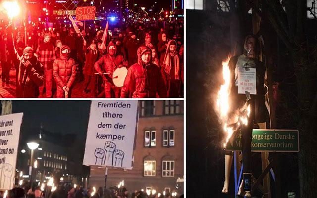 وتجسيدا لحدة الاحتقان بين الشارع والحكومة الدنماركية، قام متظاهرون بتعليق دمية ترمز لرئيسة الحكومة "mette frederiksen"، وكتب حول رقبتها: " يجب قتلها " تم قام متظاهرون بإحراقها !