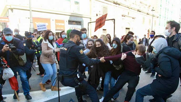 واندلعت احتجاجات جديدة في عدة مدن إسبانية في وقت متأخر من مساء يوم الجمعة 20 فبراير 2021، احتجاجاً على اعتقال مثير للجدل لمغني راب شهير حكم عليه مؤخراً بالسجن تسعة أشهر بتهمة إهانة النظام الملكي وتمجيد العنف.