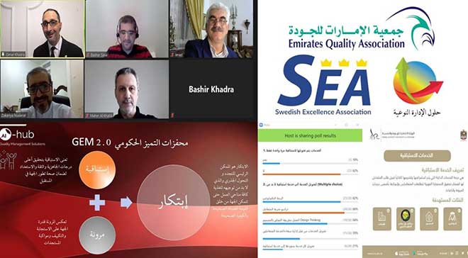 نظمت جمعية الإمارات للجودة، مساء يوم السبت 20 مارس 2021، محاضرة علمية افتراضية حول موضوع “الخدمات الاستباقية في المؤسسات"، بالتعاون مع الجمعية السويدية للتميز وشركة حلول الإدارة النوعية، قدمها المستشار عمر بشير خضرا، مدير عام شركة الحلول الإدارة النوعية بدبي، بمشاركة 47 شخصاً من خبراء الجودة والتميز المؤسسي يمثلون 7 دول عربية.