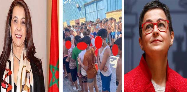 إسبانيا تبلغ السفيرة المغربية باستيائها من الدخول الجماعي للمهاجرين مشهد للنازحين المغاربة، ووزيرة خارجية إسبانيا أرانتشا غونزاليث لايا، والسفيرة المغربية كريمة بنيعيش