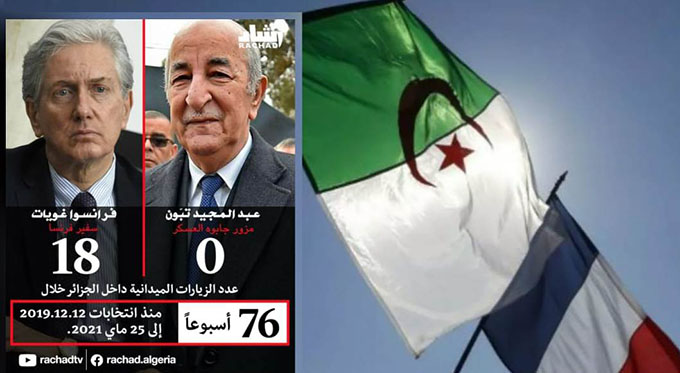 وفي تباين كامل عن ذلك، يجوب سفير فرنسا "فرانسوا غويات" البلاد طولاً وعرضاً وكأنّه هو الحاكم الفعلي في الجزائر، حيث بلغت عدد خرجاته خلال نفس الفترة 18 خرجة منها ما كان لمدن وبلديات وحضور مناسبات وزيارات مجاملة".