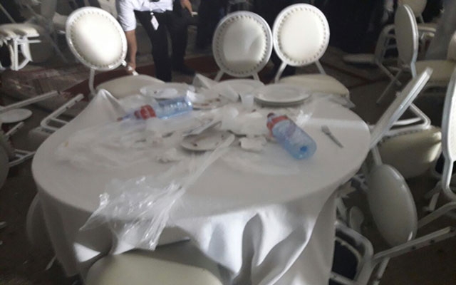 العشرات من الصحون تكسرت نتيجة التراشق بين الجانبين وما رافقها من تراشق بالكراسي، خلف إصابات متفاوتة الخطورة نقلوا على إثرها للمستشفى لتلقي العلاجات الضرورية..