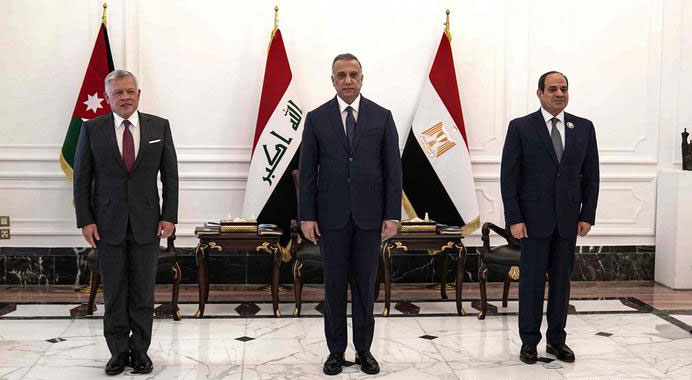 الرئيس المصري عبد الفتاح السيسي مع رئيس الوزراء العراقي مصطفى الكاظمي والعاهل الأردني الملك عبد الله الثاني