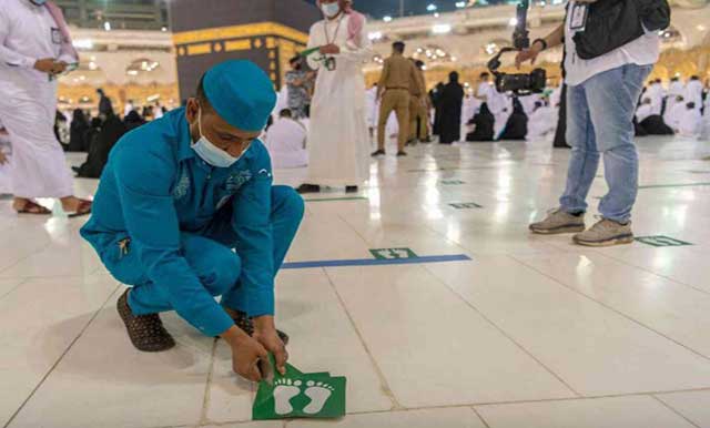 أزالت الرئاسة العامة لشؤون المسجد الحرام والمسجد النبوي ملصقات التباعد الجسدي من جميع المواقع في المسجد الحرام.