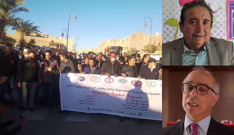 من وقفة/ مسيرة احتجاجية بزاكورة) على قرار مذكرة بنموسى، وفي الإطارين من الأعلى الأستاذ إبراهيم رشيدي والوزير بنموسى