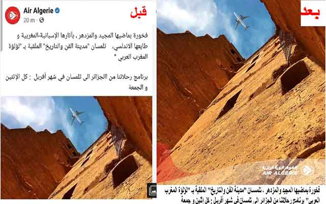 استنفار قوي وعام وغضب عارم لجنرالات النظام العسكري الجزائري بثكنة بن عكنون وبيادقه من مسؤولي قصر المرادية وشعب "بومدين الحلوف" بعد نشر شركة الطيران الوطنية "الخطوط الجوية الجزائرية Air Algérie" ، لقصاصة إشهارية لمدينة تلمسان تتميز "بآثارها التاريخية المغربية الإسبانية ، ولمستها الأندلسية ، بلقب لؤلؤة المغرب العربي".