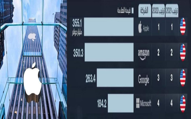 احتلت شركة “آبل” العالمية، صدارة قائمة أغلى العلامات التجارية الأغلى في العالم لعام 2022، مع بقيمة تسويقية قياسية، تعدت 355 مليار دولار، محققة ارتفاعا بحوالي 35 بالمئة، وفقا لقائمة "براند فاينانس"، تلتها شركة "أمازون" ثم "جوجل”.